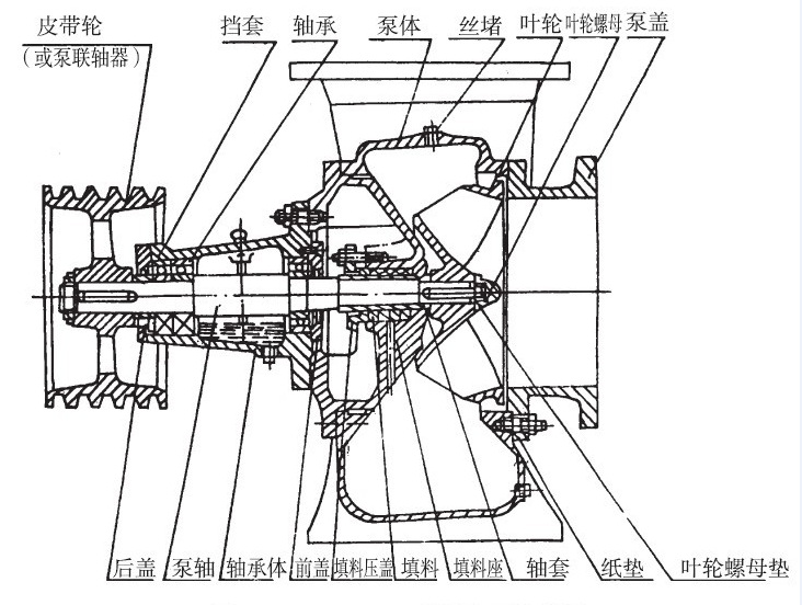 3、轴封装置用填料密封结构。其作用是防止空气吸人泵内和防止水从泵内过多地沿轴。