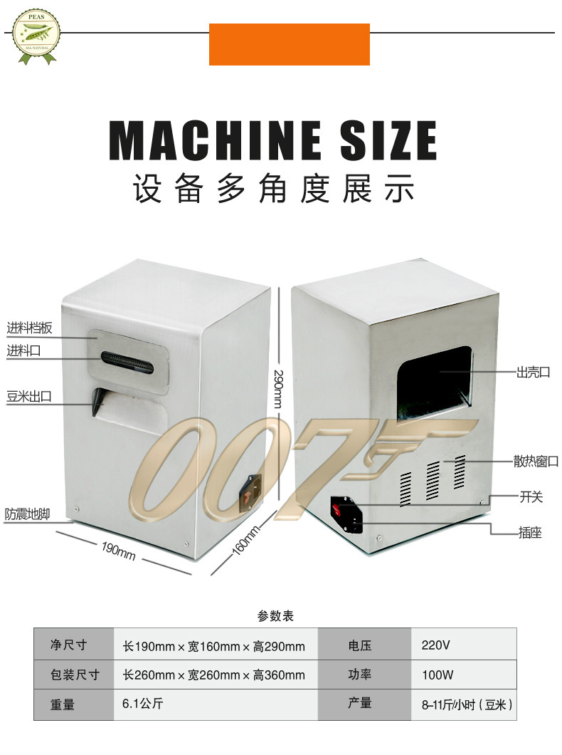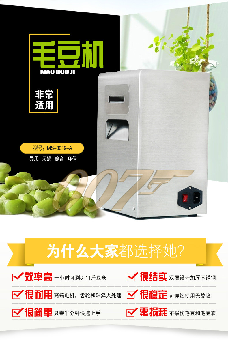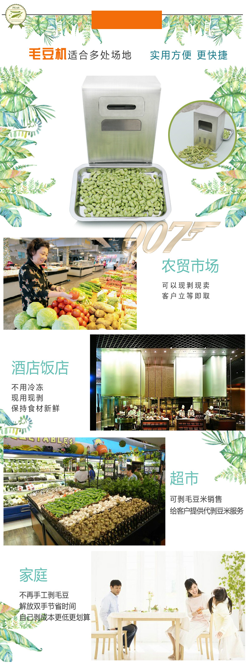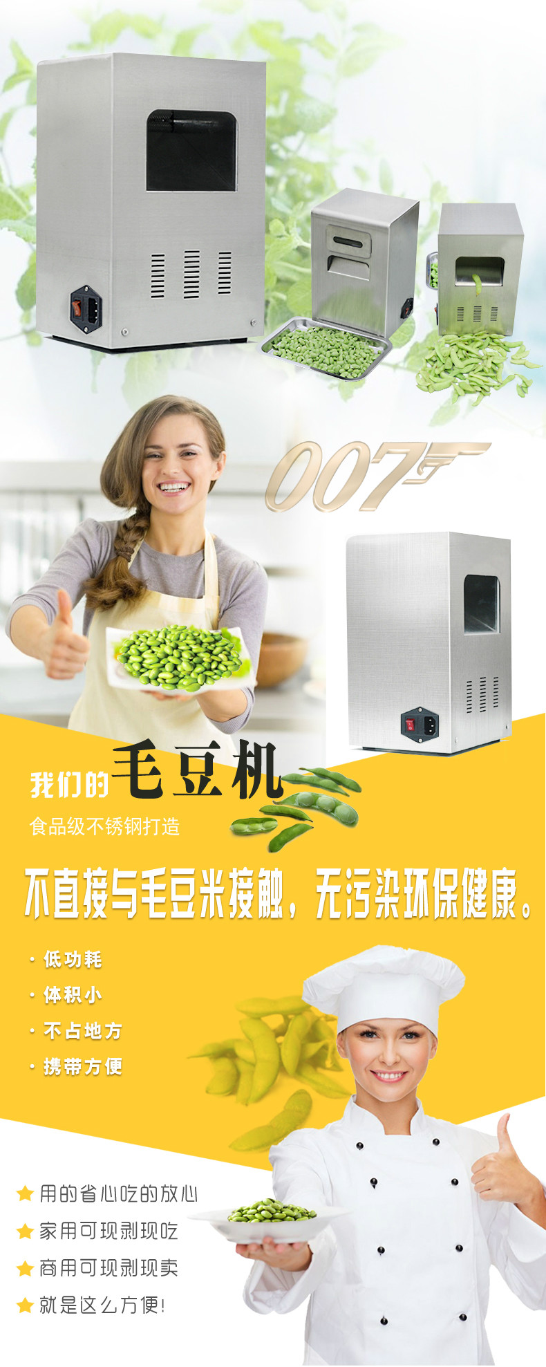 产品X势:1、低功耗2、体积小3、不占地方4、携带方便5、食品X不锈钢打造6、用的省心、吃得放心7、家用可现剥现吃8、商用可现剥现卖9、不直接与毛豆米接触,无污染环保健康