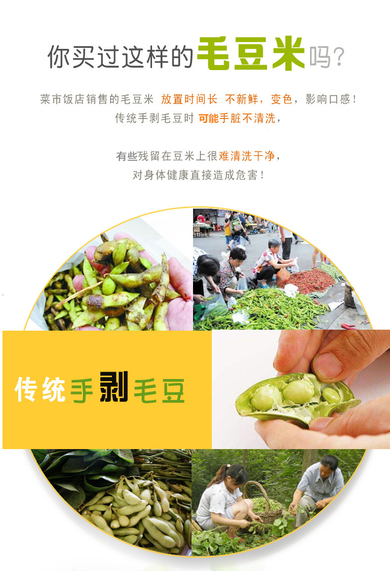 菜市饭店销售的毛豆米放置时间长、不新鲜、变色,影响口感!传统手剥毛豆时,手脏不清洗,手上有真菌感染的患者剥的毛豆您敢买吗?脏东西残留在毛豆上很难清洗干净,对身体健康直接造成危害!