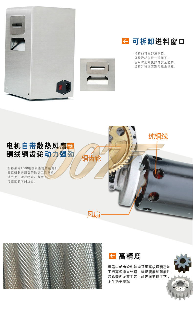 3、整机(除易损耗件如压轴、齿轮、轴套部位和进料挡板上的橡皮不在售后保修范围)质保一年,电机损坏请不要剪断电机线,寄回厂里维修即可!