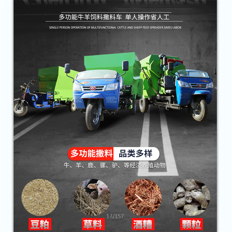 撒料车主要是以柴油三轮,电动三轮为动力,是低能耗、无污染、无噪音、无危险的牛场饲喂车,是真正绿色环保的机械,该机械的应用范围很广阔,主要是牛羊场,而且,撒料车的设计是经过相关部门质量认证的,产品质量保证百分百可靠快速标准喂料,减少劳力!该设备分三种规格适用于不同场地运作,不同尺寸的养殖喂料车,供用户选用,如果有特种尺寸的客户,本厂可按需定做;该机器采用农用三轮车(含电起动装置)运送,动力强劲低能耗,通过性高。降低劳动强度,减少饲喂成本可双侧撒料,饲喂更快捷高效。物料抛撒迅速,档位调节撒料速度。分批投放饲草,针对牛场及羊场分群饲喂,适于各种规模牧场。机动性强、通过性强、转弯半径小,更加灵活方便。
