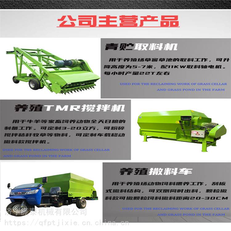 可将各种牧草,农作物秸秆,青贮饲料等纤维性饲料粉末或颗粒混合搅拌均匀后,投入本车内,进行投喂作业。使用简单方便,易于操作,产品质量可靠,低成本,低人工,低消耗,高效率。