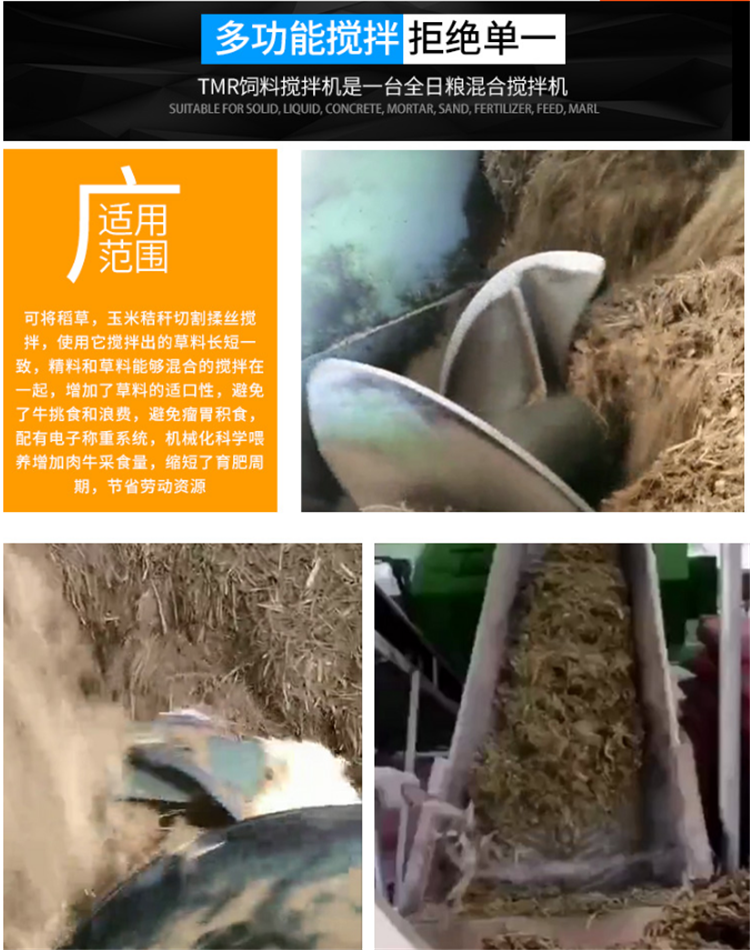 TMR饲料搅拌机是在消化国外X技术基础上开发出来的新一代牛场羊场饲养设备,能将各种干湿稻草、农作物秸杆、青贮饲料等纤维饲料和精饲料直接进行混合搅拌。充分利用各种饲草及农作秸杆,不破坏纤维成分,使饲料的能量效率化。饲料混合均匀度高,能量摄取均衡,降低工人劳动程度。改善饲养环境,提高饲养场空间利用率。