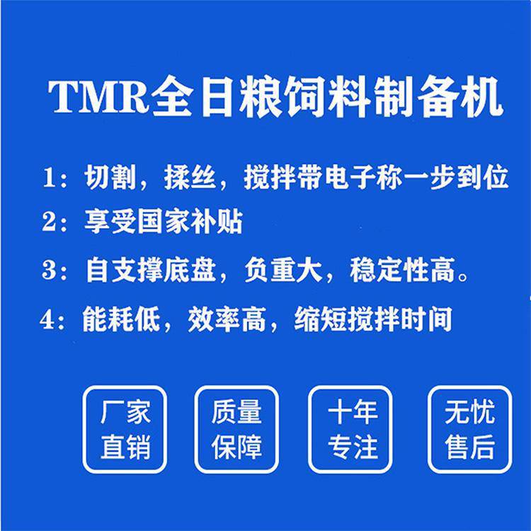 TMR饲料搅拌机是在消化国外X技术基础上开发出来的新一代牛场羊场饲养设备,能将各种干湿稻草、农作物秸杆、青贮饲料等纤维饲料和精饲料直接进行混合搅拌。充分利用各种饲草及农作秸杆,不破坏纤维成分,使饲料的能量效率化。饲料混合均匀度高,能量摄取均衡,降低工人劳动程度。改善饲养环境,提高饲养场空间利用率。